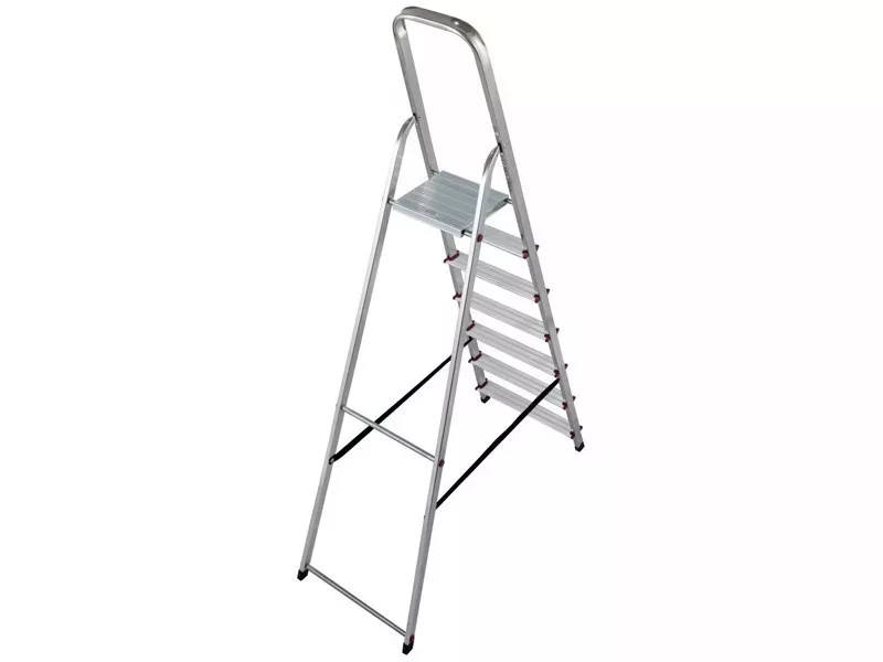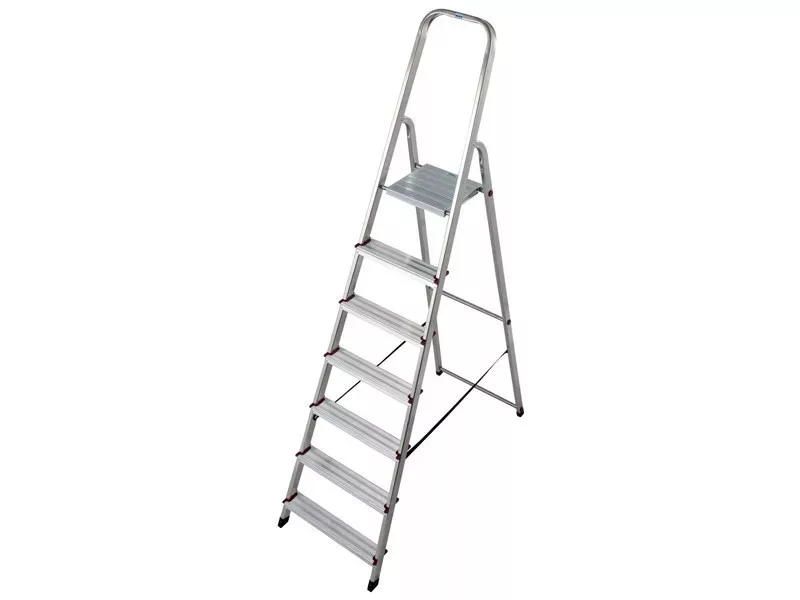 Könnyű és masszív alumíniumból készült minőségi háztartási létra 7 fokos (6+1 fellépő) kialakítású 150 kg-os terhelhetőséggel. Széles kényelmes, csúszásgátló kialakítású létrafokokkal, az éleknél műanyag élvédőkkel és kicsúszást gátló lábakkal. Mindenféle padlózaton biztonságos és kényelmes munkavégzést biztosít. Alkalmas otthoni háztartási célokra, de akár üzletekbe, irodákba és raktárakba is ideális. Ha nem használjuk, a létra összecsukható és kis helyen tárolható