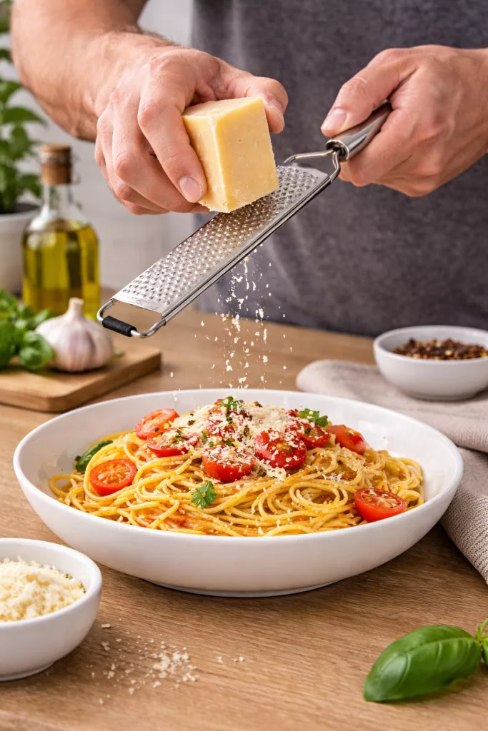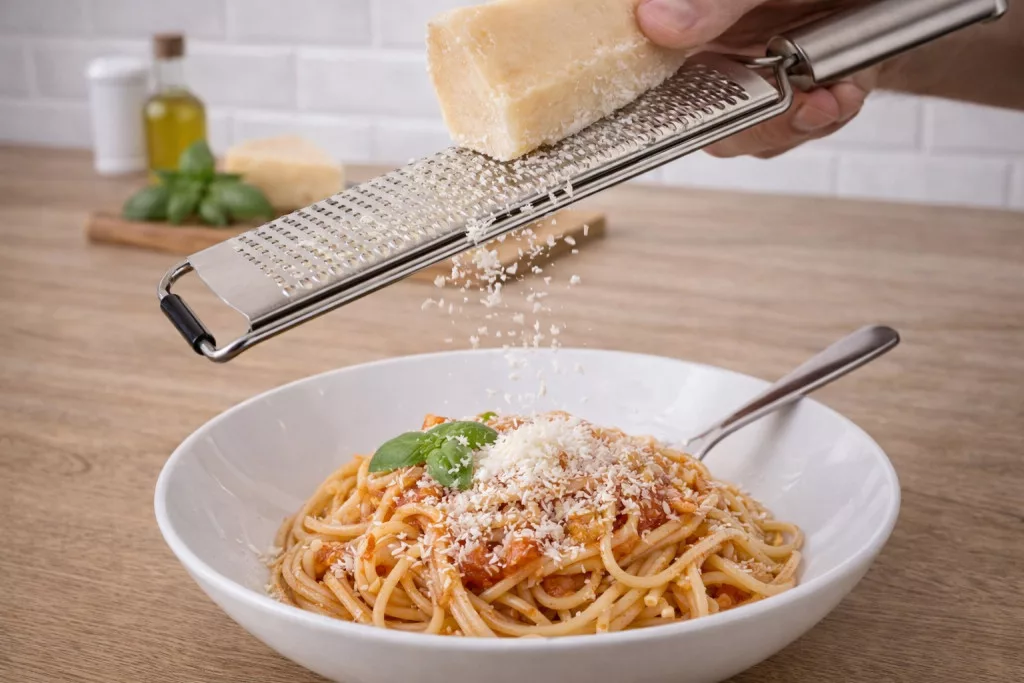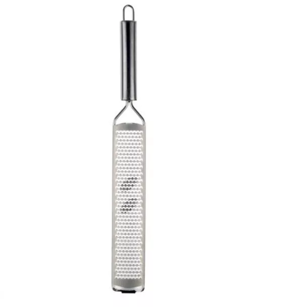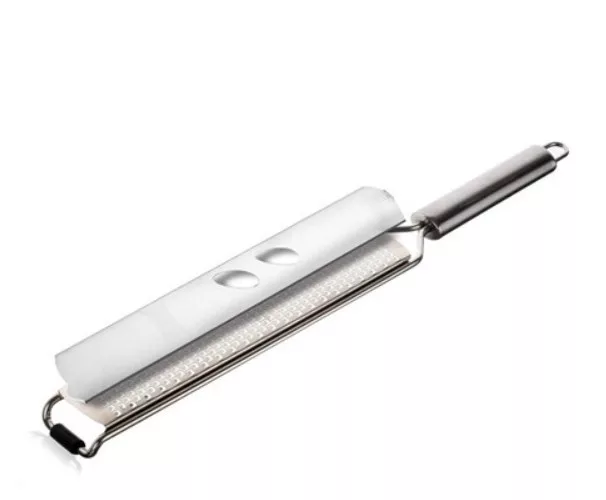 Banquet márkájú rozsdamentes nyeles reszelő. Kiválóan alkalmas sajt, citromhéj, csokoládé, szerecsendió, vagy gyömbér reszelésére. Műanyag védőtokkal van ellátva. Teljes hossza 35 cm, reszelő felület hossza 20 cm. Anyaga: rozsdamentes acél. Mosogatógépben mosható.