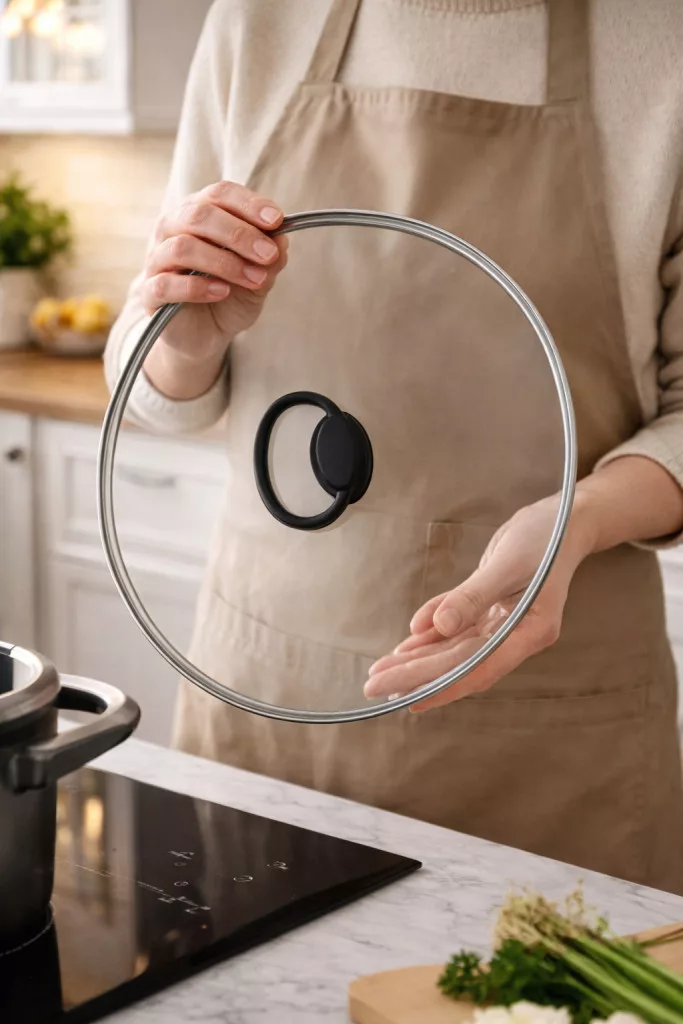 Üvegfedél SMART Plus 30 cm, 30 cm átmérőjű serpenyőkhöz és edényekhez. A fedő kiváló minőségű edzett üvegből készült, és hőálló fogantyúval van felszerelve, amely tárolás közben lehajtható, így tárolóhelyet takaríthat meg. Mosogatógépben és mikróhullámú sütőben nem használható. Kerülje a karcosodást okozó szerek és eszközök használatát!