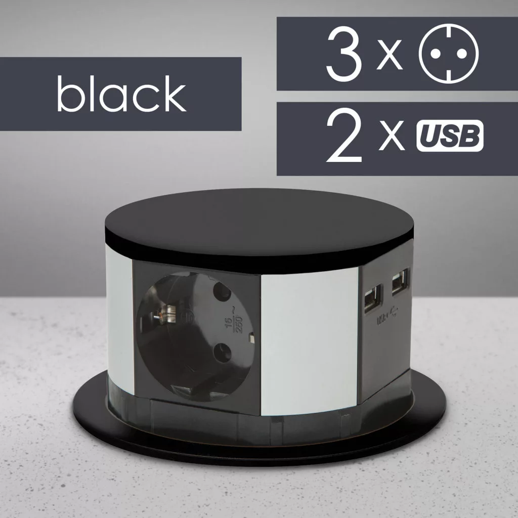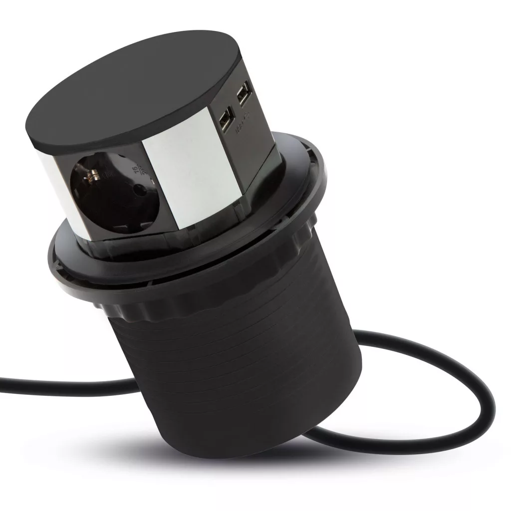 Süllyeszthető elosztó irodai és otthoni felhasználásra, fém házzal. Asztala, bútora legyen mindig elegáns és rendezett, mégis funkcionális. A beépített USB csatlakozónak köszönhetően könnyen töltheti mobil eszközeit. A rejtett elosztó kiváló megoldás lehet ha már például kész konyhával rendelkezik, de nincs elegendő konnektor a kívánt helyen. Ilyenkor falvésés és villamos hálózat bővítés nélkül, remek alternatíva lehet egy rejtett elosztó. Egy mozdulat és máris rendelkezésre áll 3 szabad konnektor. Ideális lehet olyan elektromos eszközökhöz, amit nem folyamatosan használunk, kenyérpirító, vízforraló... Ha használaton kívül vannak, a "töltőoszlop" egy mozdulattal elrejthető, ezzel is megkönnyítve például a takarítást, valamint rendezett, letisztult külsőt ad a helységnek.