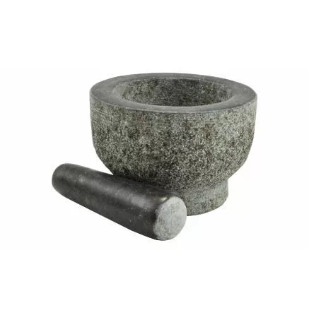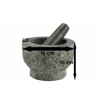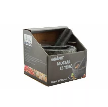 Ajánljuk: fűszer-, gyógyszer-, magvak aprításához, fűszeres olajok készítéséhez.A természetes gránit anyagából adódóan a színek, az árnyalatok és a mintázat eltérőek lehetnek.Mérete: 15 cm átmérőjű, 10 cm magas a mozsár, 14,5 cm hosszú és 4 cm átmérőjű a törő, doboz mérete 16.5x16x15 cm.