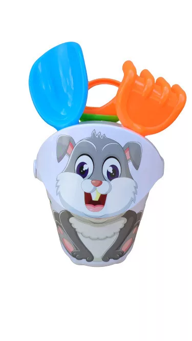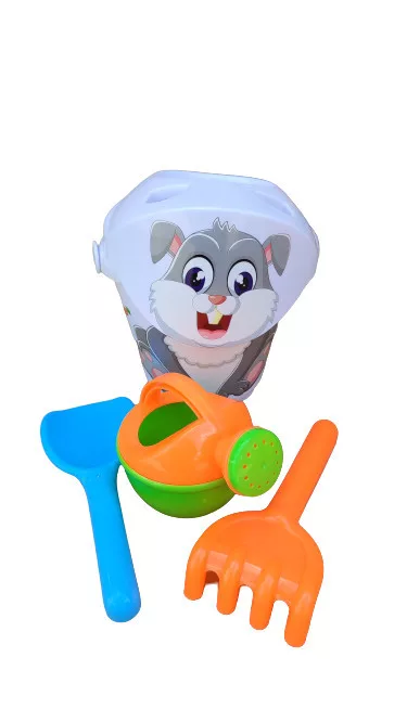Vidám állatos vödör, locsolókanna, ásó és gereblye. Kiváló játék kisgyerekeknek a strandron, a homokóban vagy akár a kertben. A játékok műanyagból készültek, 3 éves kortól ajánljuk.
