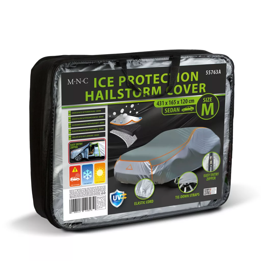 Védje autóját az időjárás viszontagságaitól ezzel a kiváló minőségű, jégeső elleni autótakaró ponyvával! A ponyva védelmet nyújt a jégeső, UV-sugárzás, eső és por ellen, így hosszú távon óvja autója karosszériáját és fényezését. A takaró 150D Oxford szövetből és 4 mm vastag EVA habrétegből készült, amely hatékonyan csillapítja a jég és faágak okozta ütődéseket, miközben biztosítja a megfelelő szellőzést is. Használatával megelőzhető a karosszéria sérülése, szennyeződése is. A beépített háromszög alakú fényvisszaverő logó javítja a láthatóságot, a két rögzítőpánt pedig biztosítja, hogy a ponyva erős szélben is stabilan a helyén maradjon. Az oldalán található cipzáras rész segítségével könnyen bejuthat az gépjárműbe a ponyva eltávolítása nélkül.