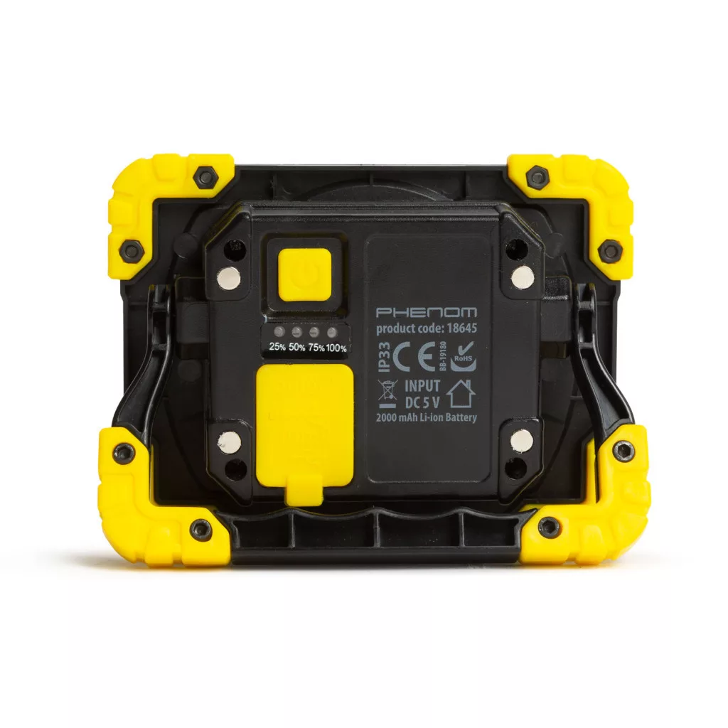 Phenom termékcsalád minőségi új reflektora, amely nélkülözhetetlen kelléke lehet műhelyeknek, építkezéseknek vagy akár háztartásának. Az 5 W-os COB LED ~500 Lumen fényerővel akár 6 órán keresztül világítja be a teret. A beépített 5V-os USB port megfelelő tápellátást biztosít például mobiltelefonja feltöltéséhez. A készülék hordozhatóságáról és rögzíthetőségéről kihajtható fogantyú és mágnesek gondoskodnak.