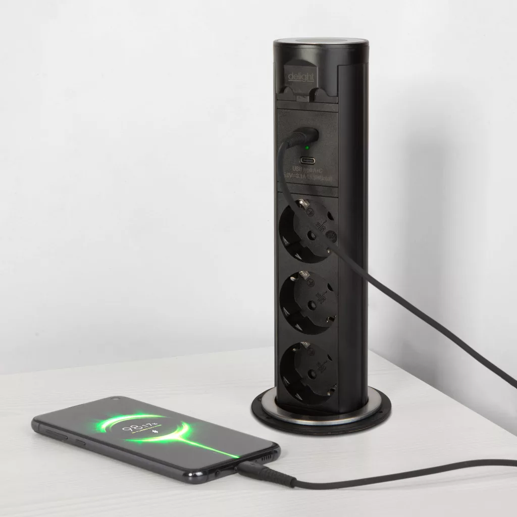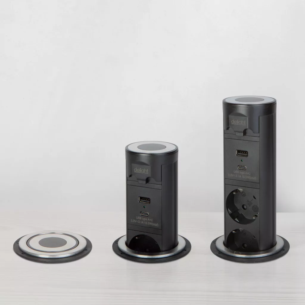 Motorosan süllyeszthető rejtett elosztó irodai és otthoni felhasználásra, fém házzal, 3 db gyermekvédelemmel ellátott hálózati aljzattal, dupla USB töltőegységgel. A legtöbb felületbe és design-ba beleillő kialakítás, függőleges beépítési lehetőség mérsékelten vízhatlan kezelőfelület.