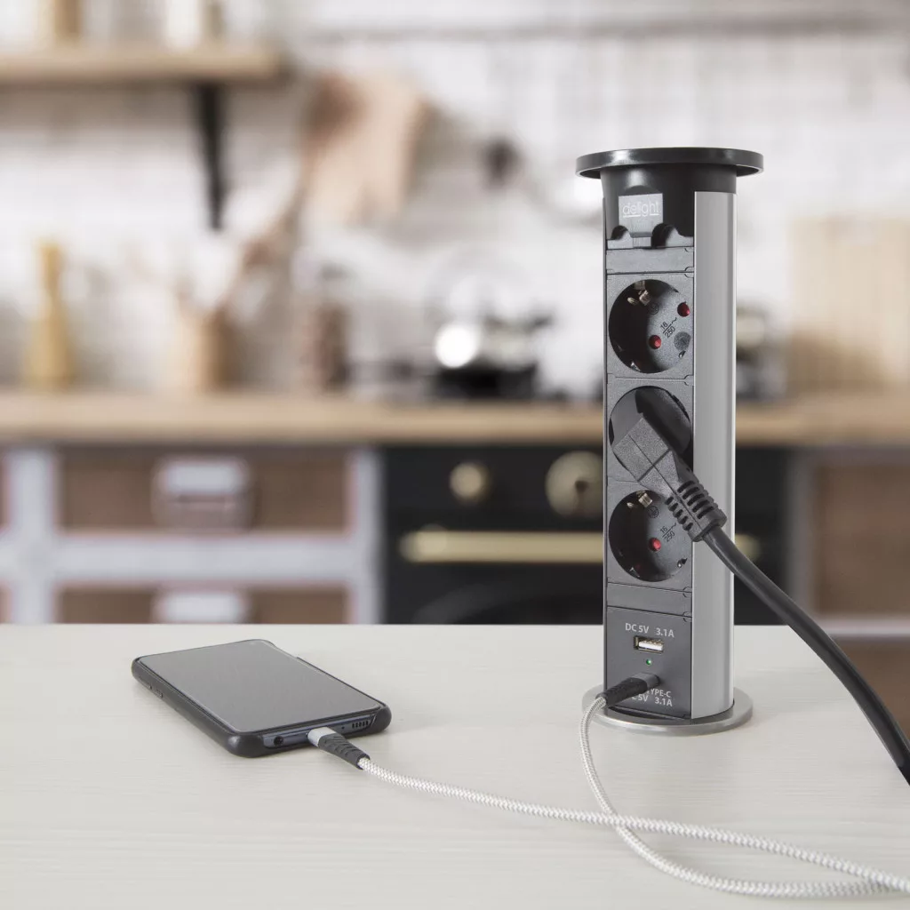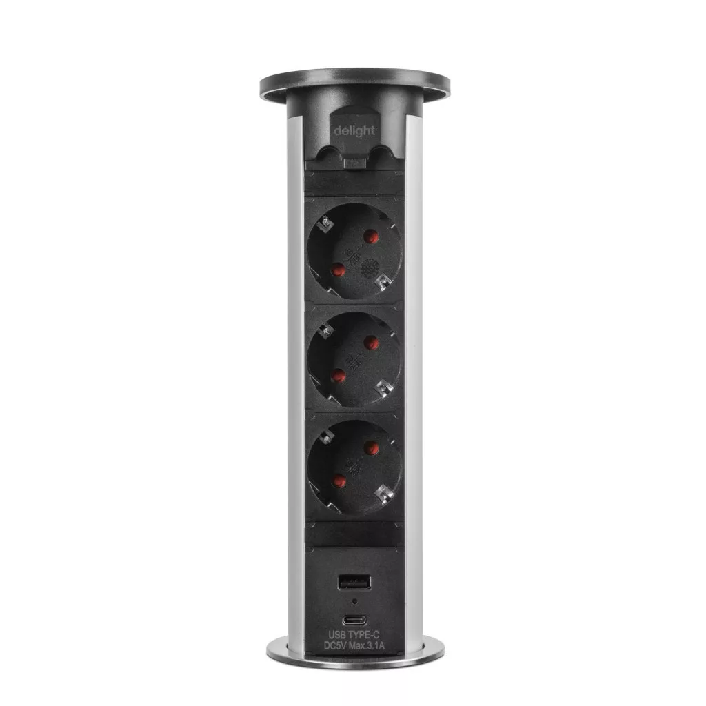 Motorosan süllyeszthető rejtett elosztó irodai és otthoni felhasználásra, fém házzal, 3 db gyermekvédelemmel ellátott hálózati aljzattal, dupla USB töltőegységgel. A legtöbb felületbe és design-ba beleillő kialakítás, függőleges beépítési lehetőség mérsékelten vízhatlan kezelőfelület.