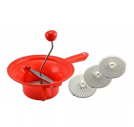 Ajánljuk hal, paradicsom és egyéb zöldségek, gyümölcsök passzírozásához.A bolognai spagetti, a töltött káposzta, a paradicsomos húsgombóc akkor az igazi, ha házilag készült szósszal készül, ehhez hasonló ételek elkészítéséhez lehet segítségére ez a rozsdamentes acél betétes passzírozó. Természetesen hal passzírozására is használhatja, hogy csodás halászlevet főzhessen családjának,barátainak.A csomag tartalma 3 db különböző méretű betét, 1 db passzírozó, 1 db passzírozó tál