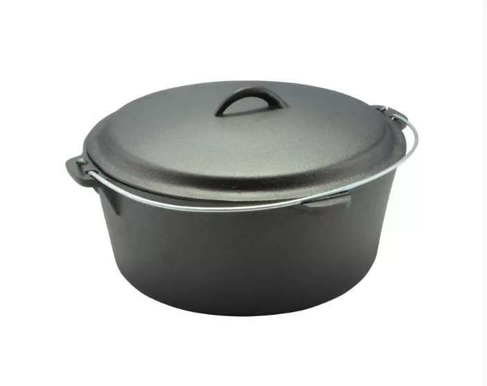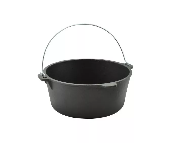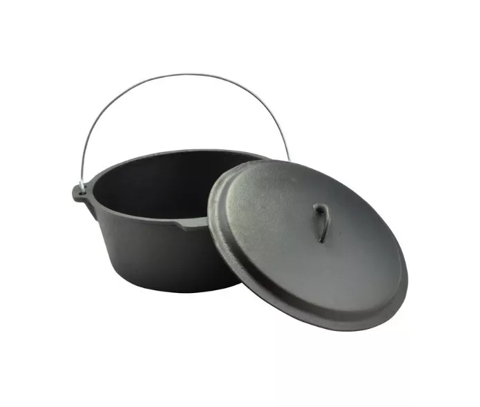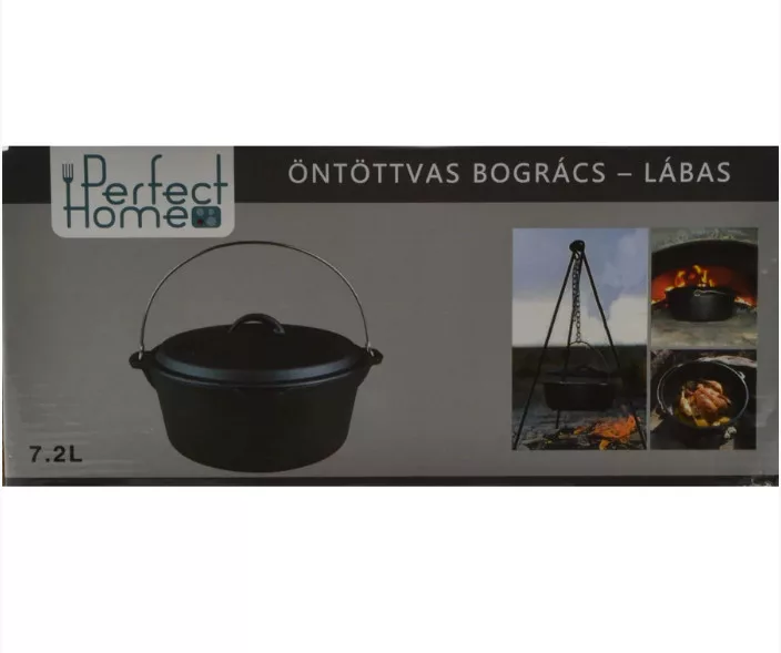 A Perfect Home öntöttvas bogrács-lábas fedővel (holland sütő) 30 × 14 cm, 7,2 literes kiváló választás nagyobb adagok elkészítéséhez, legyen szó szabadtéri főzésről vagy konyhai használatról. Az edény tartós öntöttvasból készült, felülete növényi olajjal kezelt, amely biztosítja az egyenletes hőelosztást és a hosszú élettartamot. Használható szabad tűzön, gáz- és elektromos tűzhelyen, valamint sütőben, parázson és kemencében is. Használat közben minden esetben javasolt sütőkesztyű alkalmazása. Tisztítása egyszerű: minden használat után meleg, mosószeres vízzel mossa el, alaposan szárítsa meg, majd a rozsdásodás megelőzése érdekében vékonyan kenje be zsírral. Első használat előtt távolítsa el a rozsdásodást gátló növényi olajréteget. Ehhez mossa el az edényt forró vízben, semleges folyékony mosogatószerrel, törölje teljesen szárazra, majd kenje ki zsírral vagy szalonnával, és alaposan hevítse fel. A terméket holland kemence, holland sütő vagy Dutch Oven néven is ismerhetik. Mérete: 29,5cm átmérőjű; 36 cm széles; 13,5cm magas fedő nélkül; 19,5 cm magas fedővel
