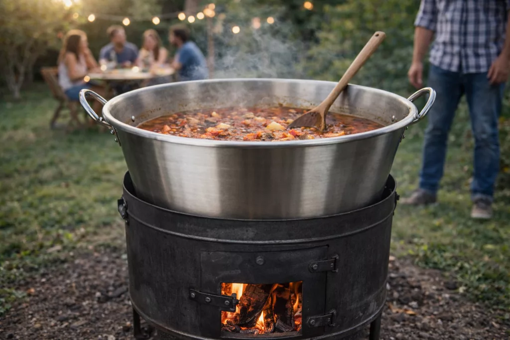 A Perfect Home rozsdamentes üst ~145 l kiváló választás nagyobb mennyiségű ételek készítéséhez szabadtéren. 1,2 mm vastag rozsdamentes acélból készült, így tartós és higiénikus. Ideális bográcsozáshoz, főzéshez, rendezvényekre vagy családi összejövetelekre. Könnyen tisztítható, hosszú élettartamú kialakítással. Mérete: 79 cm belső átmérő; 83 cm külső átmérő; 95,5 cm széles fülekkel; 58 cm alsó átmérő; 39 cm magas; 43,5 cm magas fülekkel