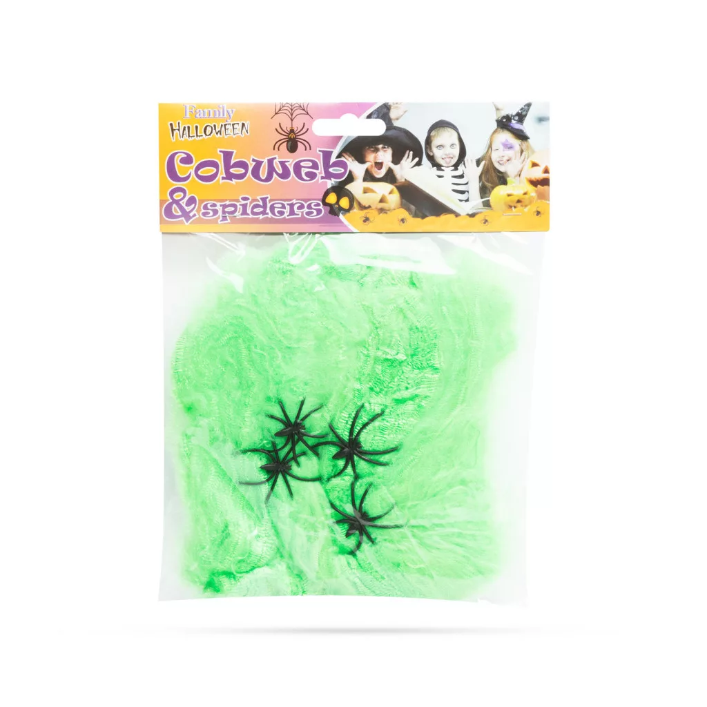 Igazán eredeti, hátborzongató halloween-i dekoráció ez a vattaszerű pókháló, pókokkal. Több színben elérhető! Nélkülözhetetlen egy igazi halloween-i party dekorálásánál.