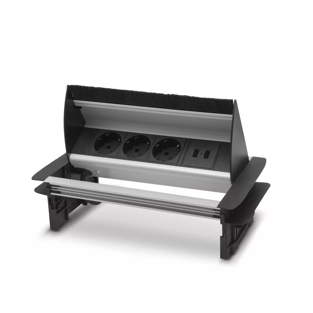 Süllyeszthető elosztó irodai és otthoni felhasználásra, fém házzal. Asztala, bútora legyen mindig elegáns és rendezett, mégis funkcionális. A beépített USB csatlakozónak köszönhetően könnyen töltheti mobil eszközeit. A rejtett elosztó kiváló megoldás lehet ha már például kész konyhával rendelkezik, de nincs elegendő konnektor a kívánt helyen. Ilyenkor falvésés és villamos hálózat bővítés nélkül, remek alternatíva lehet egy rejtett elosztó. Egy mozdulat és máris rendelkezésre áll 3 szabad konnektor. Ideális lehet olyan elektromos eszközökhöz, amit nem folyamatosan használunk, kenyérpirító, vízforraló... Ha használaton kívül vannak, az elosztó egy mozdulattal elrejthető, ezzel is megkönnyítve például a takarítást, valamint rendezett, letisztult külsőt ad a helységnek.
