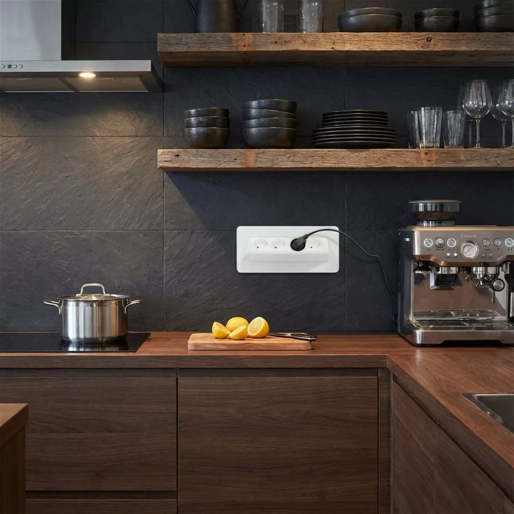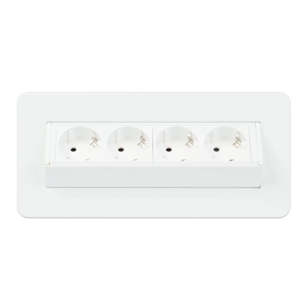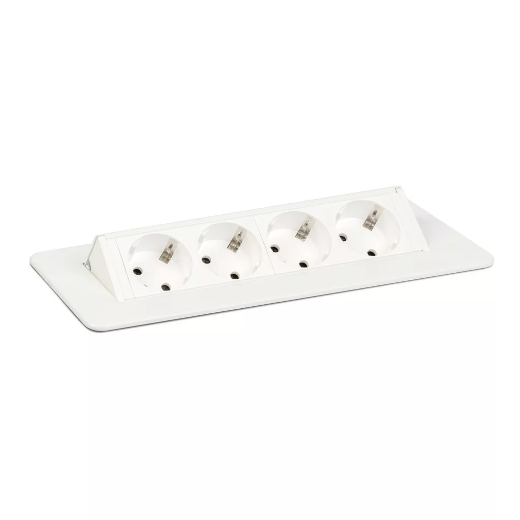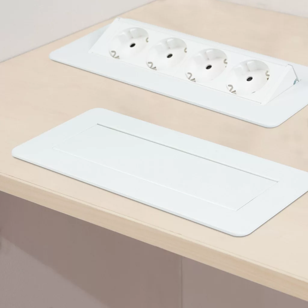 Süllyeszthető elosztó irodai és otthoni felhasználásra, matt fehér felülettel, 4 db gyermekvédelemmel ellátott aljzattal. Asztala, bútora legyen mindig elegáns és rendezett, mégis funkcionális. A rejtett elosztó kiváló megoldás lehet ha már például kész konyhával rendelkezik, de nincs elegendő konnektor a kívánt helyen. Ilyenkor falvésés és villamos hálózat bővítés nélkül, remek alternatíva lehet egy rejtett elosztó. Egy mozdulat és máris rendelkezésre áll 4 szabad konnektor. Ideális lehet olyan elektromos eszközökhöz, amit nem folyamatosan használunk, kenyérpirító, vízforraló... Ha használaton kívül vannak, az "flip-up" elosztó egy mozdulattal elrejthető, ezzel is megkönnyítve például a takarítást, valamint rendezett, letisztult külsőt ad a helységnek.