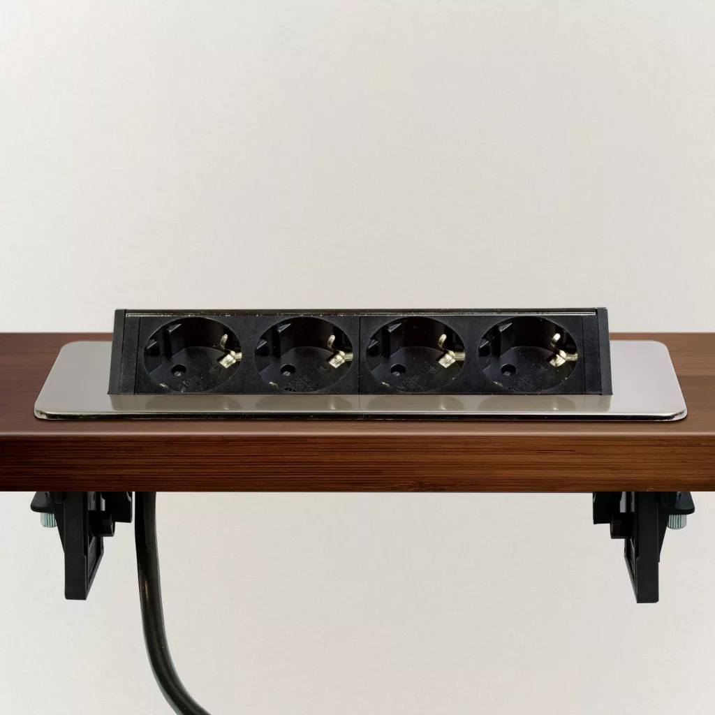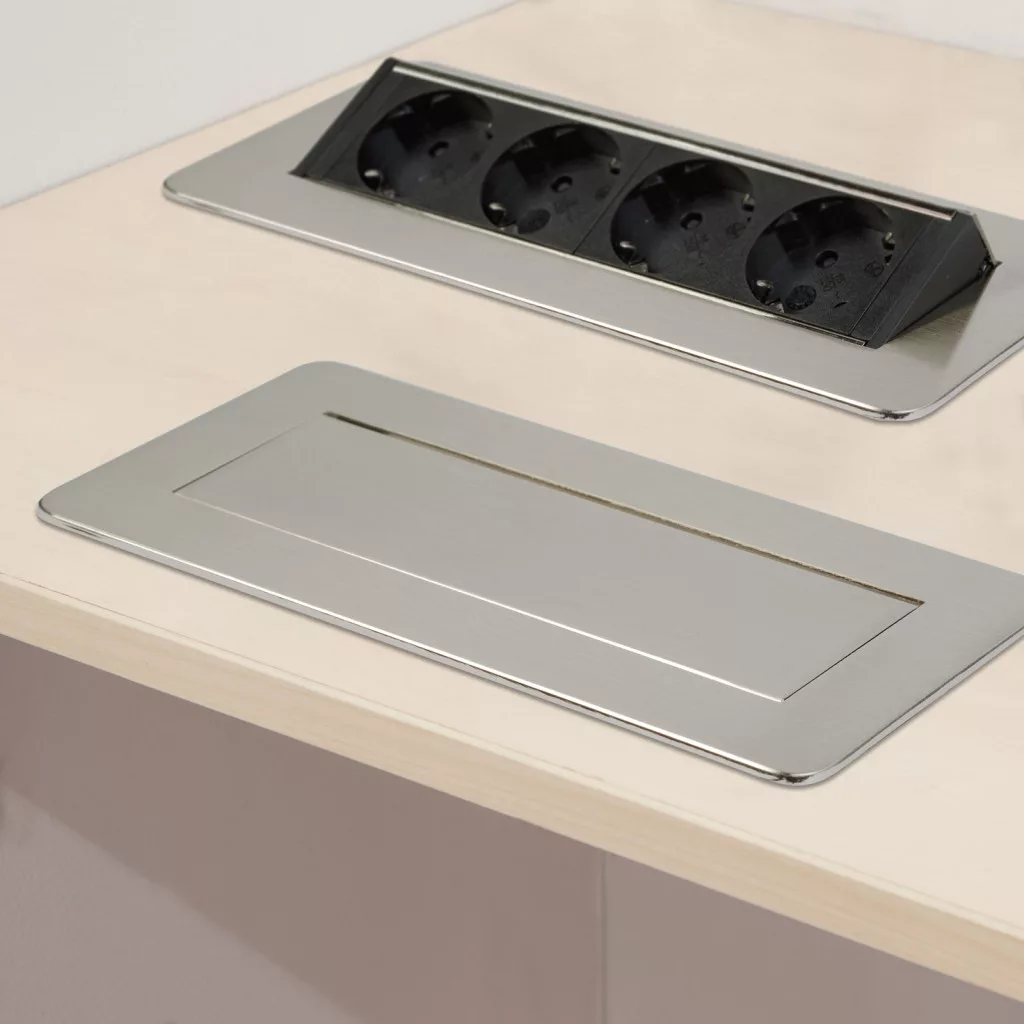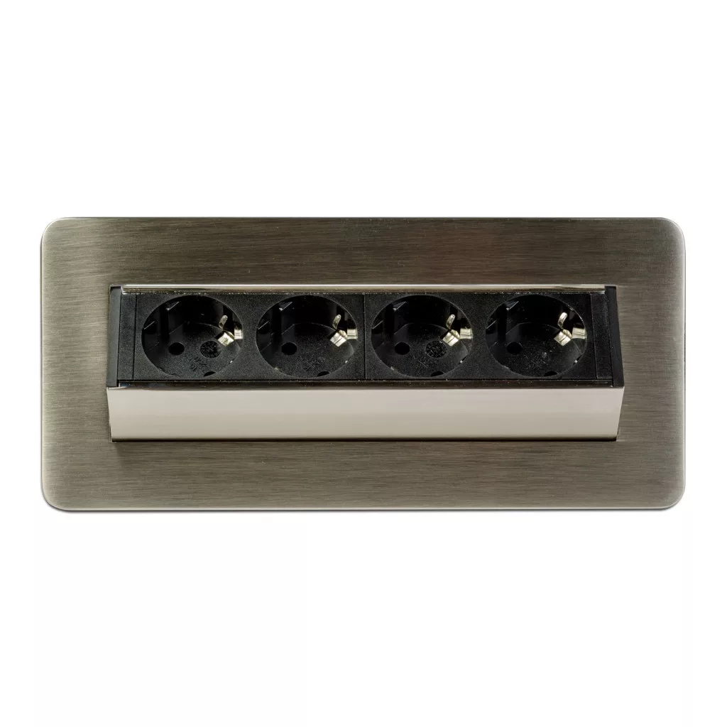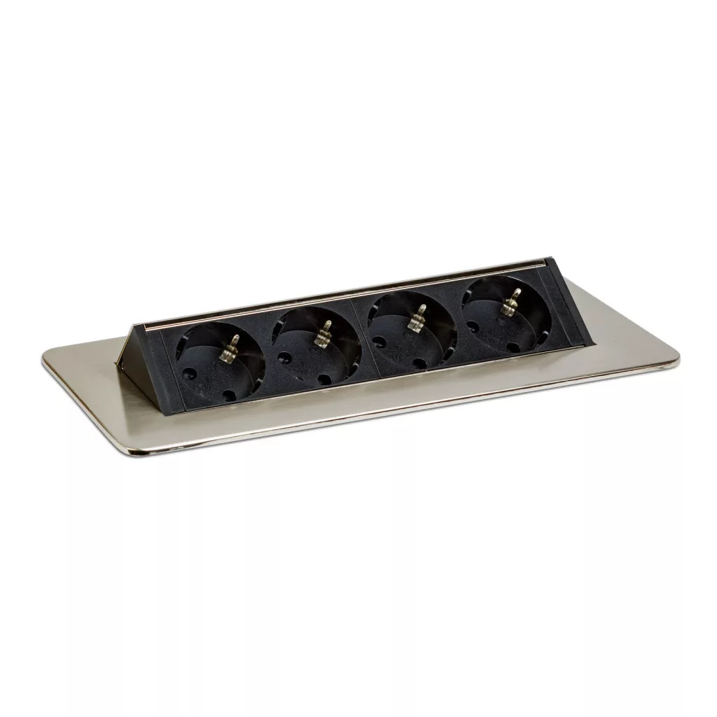 Süllyeszthető elosztó irodai és otthoni felhasználásra, szálcsiszolt felülettel, 4 db gyermekvédelemmel ellátott aljzattal. Asztala, bútora legyen mindig elegáns és rendezett, mégis funkcionális. A rejtett elosztó kiváló megoldás lehet ha már például kész konyhával rendelkezik, de nincs elegendő konnektor a kívánt helyen. Ilyenkor falvésés és villamos hálózat bővítés nélkül, remek alternatíva lehet egy rejtett elosztó. Egy mozdulat és máris rendelkezésre áll 4 szabad konnektor. Ideális lehet olyan elektromos eszközökhöz, amit nem folyamatosan használunk, kenyérpirító, vízforraló... Ha használaton kívül vannak, az "flip-up" elosztó egy mozdulattal elrejthető, ezzel is megkönnyítve például a takarítást, valamint rendezett, letisztult külsőt ad a helységnek.