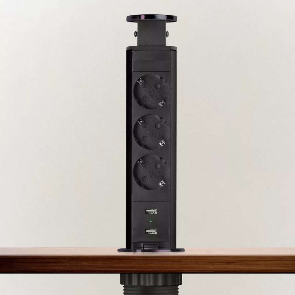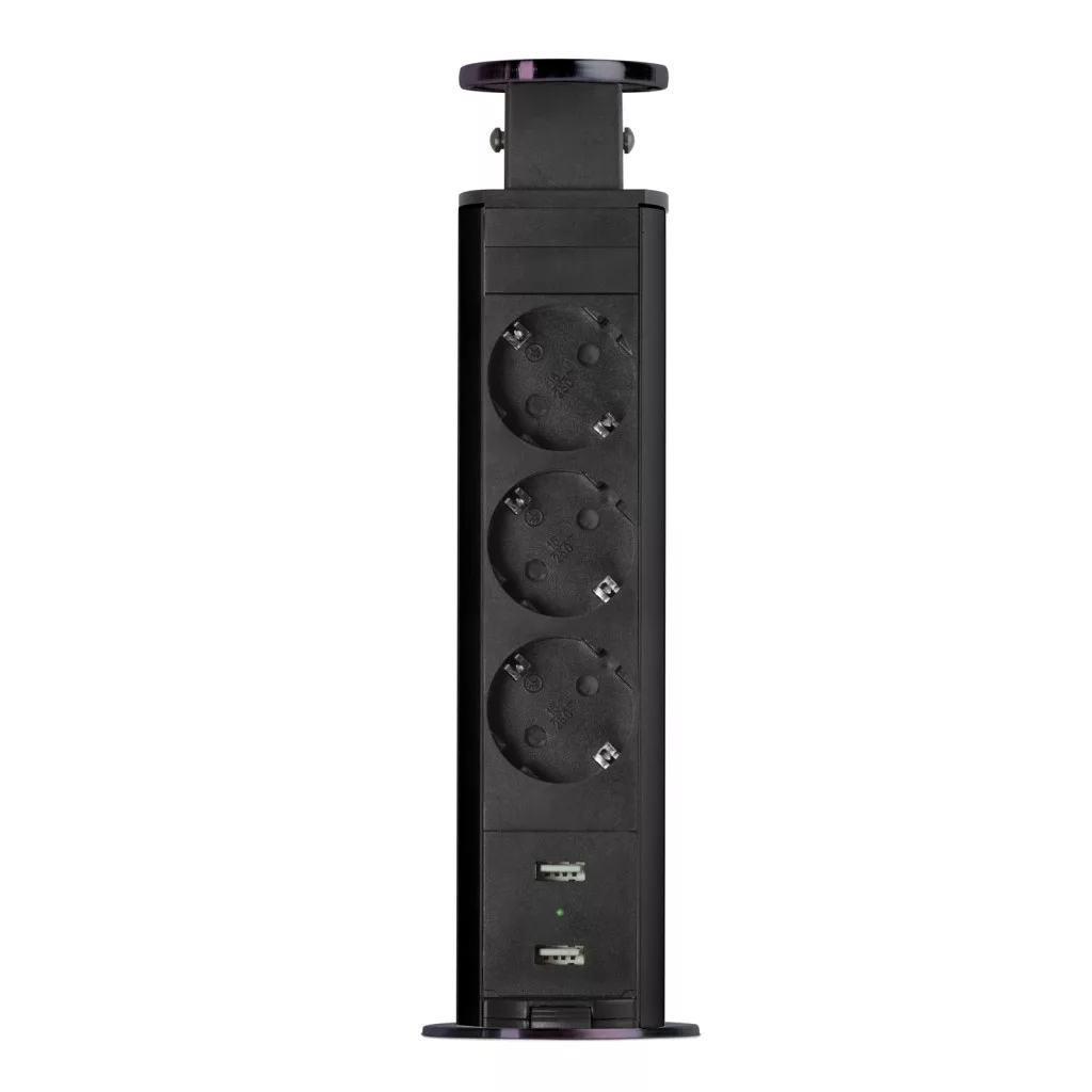 Süllyeszthető elosztó irodai és otthoni felhasználásra, fém házzal, 3 db gyermekvédelemmel ellátott aljzattal és 2 db USB csatlakozóval. Asztala, bútora legyen mindig elegáns és rendezett, mégis funkcionális. Az USB aljaztról könnyen töltheti telefonját, tabletjét vagy egyéb digitális eszközeit. A rejtett elosztó kiváló megoldás lehet ha már például kész konyhával rendelkezik, de nincs elegendő konnektor a kívánt helyen. Ilyenkor falvésés és villamos hálózat bővítés nélkül, remek alternatíva lehet egy rejtett elosztó. Egy mozdulat és máris rendelkezésre áll 3 szabad konnektor. Ideális lehet olyan elektromos eszközökhöz, amit nem folyamatosan használunk, kenyérpirító, vízforraló... Ha használaton kívül vannak, a "töltőoszlop" egy mozdulattal elrejthető, ezzel is megkönnyítve például a takarítást, valamint rendezett, letisztult külsőt ad a helységnek.