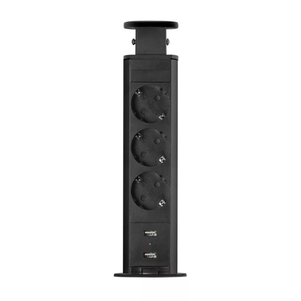 Süllyeszthető elosztó irodai és otthoni felhasználásra, fém házzal, 3 db gyermekvédelemmel ellátott aljzattal és 2 db USB csatlakozóval. Asztala, bútora legyen mindig elegáns és rendezett, mégis funkcionális. Az USB aljaztról könnyen töltheti telefonját, tabletjét vagy egyéb digitális eszközeit. A rejtett elosztó kiváló megoldás lehet ha már például kész konyhával rendelkezik, de nincs elegendő konnektor a kívánt helyen. Ilyenkor falvésés és villamos hálózat bővítés nélkül, remek alternatíva lehet egy rejtett elosztó. Egy mozdulat és máris rendelkezésre áll 3 szabad konnektor. Ideális lehet olyan elektromos eszközökhöz, amit nem folyamatosan használunk, kenyérpirító, vízforraló... Ha használaton kívül vannak, a "töltőoszlop" egy mozdulattal elrejthető, ezzel is megkönnyítve például a takarítást, valamint rendezett, letisztult külsőt ad a helységnek.