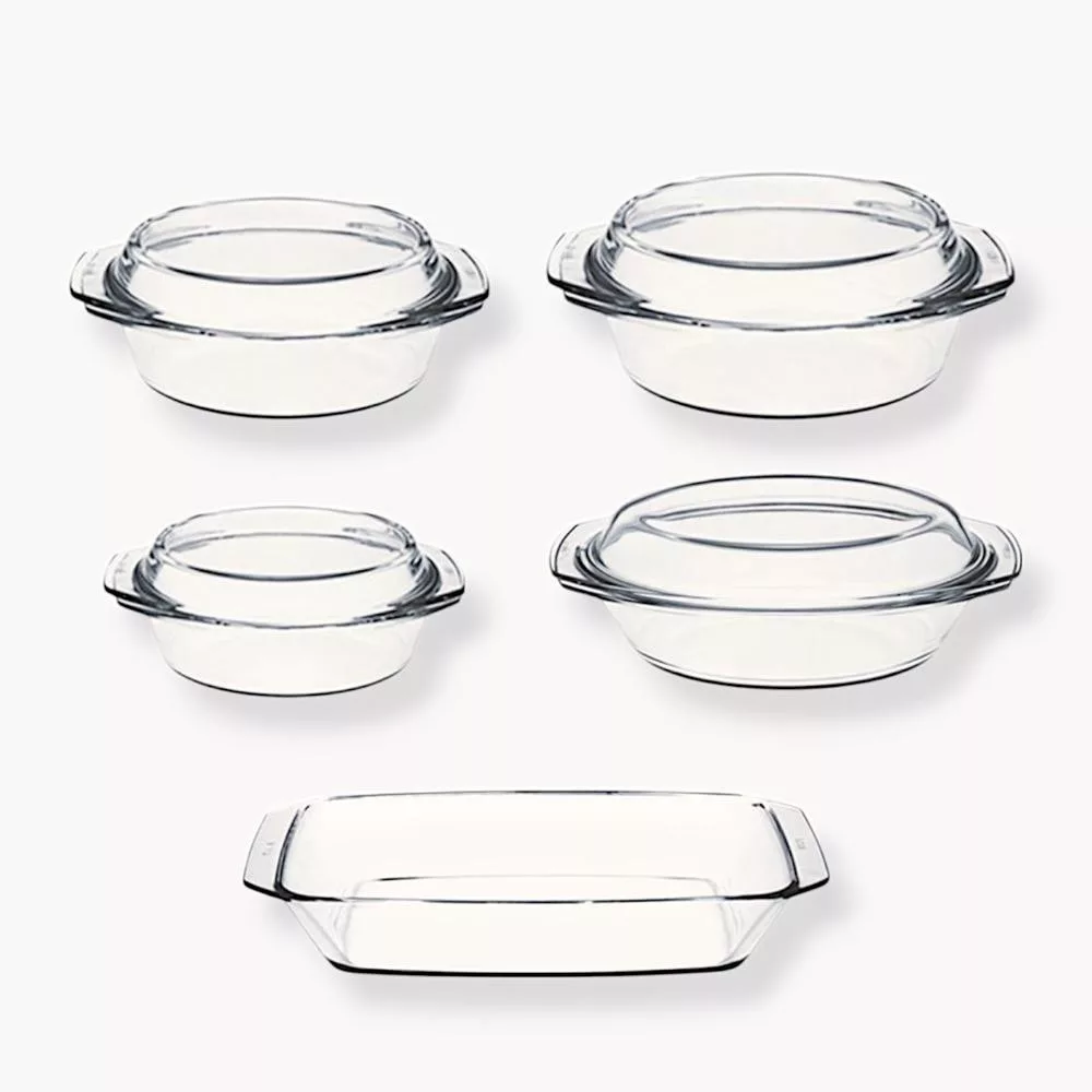 1 db kerek hőálló üvegtál fedővel (1 liter+0,4 liter); 1 db kerek hőálló üvegtál fedővel (1,5 liter+0,6 liter); 1 db kerek hőálló üvegtál fedővel (2 liter+0,9 liter); 1 db kerek hőálló üvegtál fedővel (2,4 liter+1,2 liter); 1 db kerek hőálló üvegtál fedővel (2,4 liter)