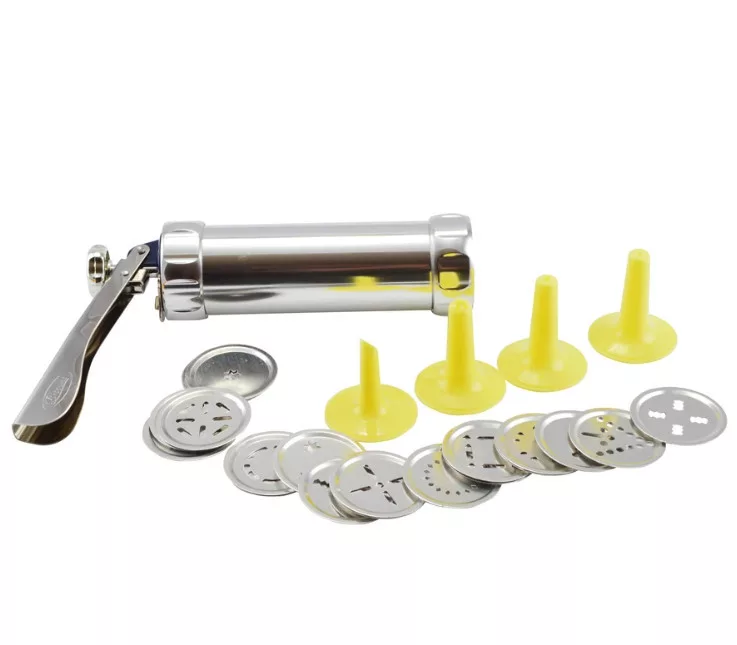 Készítsen gyönyörű, egyforma kekszeket és díszítéseket ezzel a praktikus sütinyomó–kekszkészítő szettel! A tartós alumínium, fém és műanyag anyagokból készült készülék 21 cm hosszú és 5,5 cm átmérőjű, kényelmesen használható kialakítású. A szett tartalmaz 1 db sütinyomót, 4 db habkinyomó fejet (5,5 cm hosszú, 5 cm átmérőjű) és 20 db különböző sütiformát (5 cm átmérőjű), így változatos formájú kekszeket, süteményeket és díszítéseket készíthet. Tökéletes választás ünnepi sütéshez – karácsonyra, húsvétra vagy bármilyen alkalomra, amikor a házi finomságoké a főszerep.