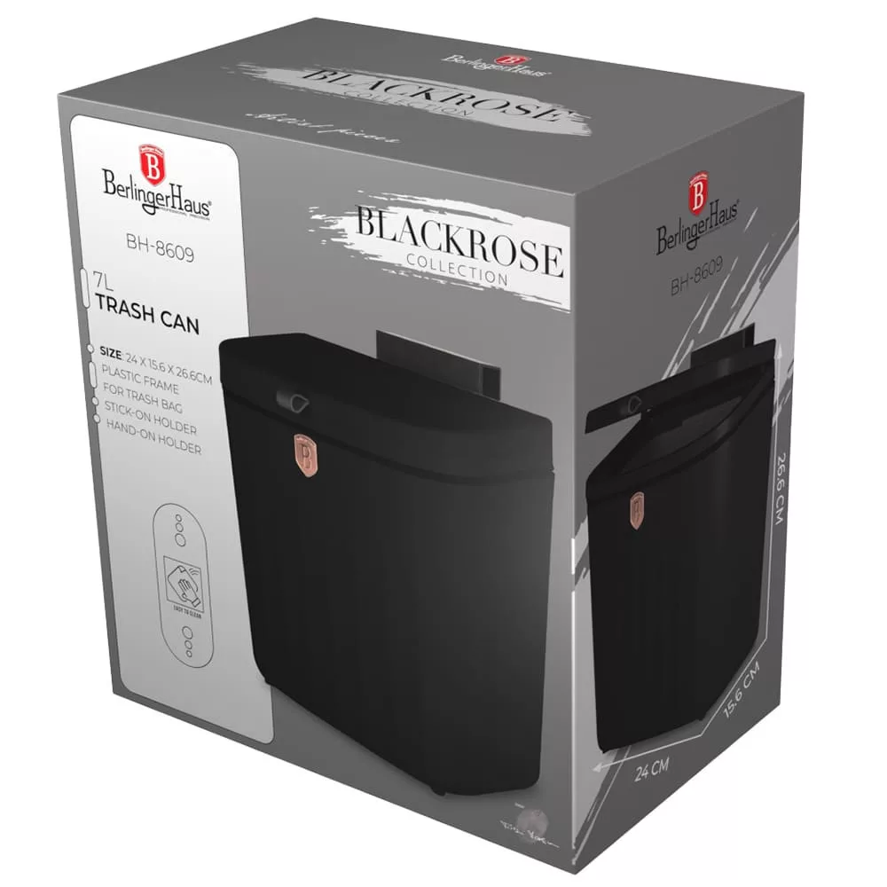 Tartós műanyagból készült. Színe elegáns fekete rózsa arany. Műanyag keret a szemeteszsákhoz : Biztosan a helyén tartja a szemeteszsákot, hogy el ne csússzon vagy leessen. Felragasztható és akasztható tartóval. Vastag falú konstrukcióval, mely tartósságot biztosít.