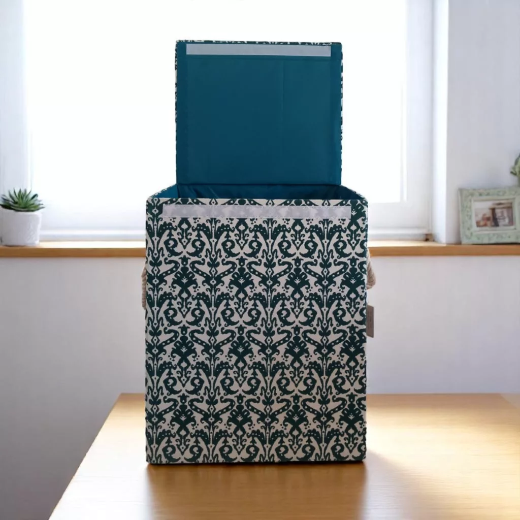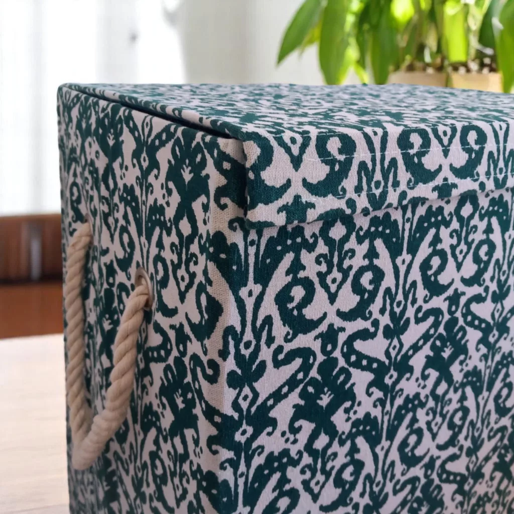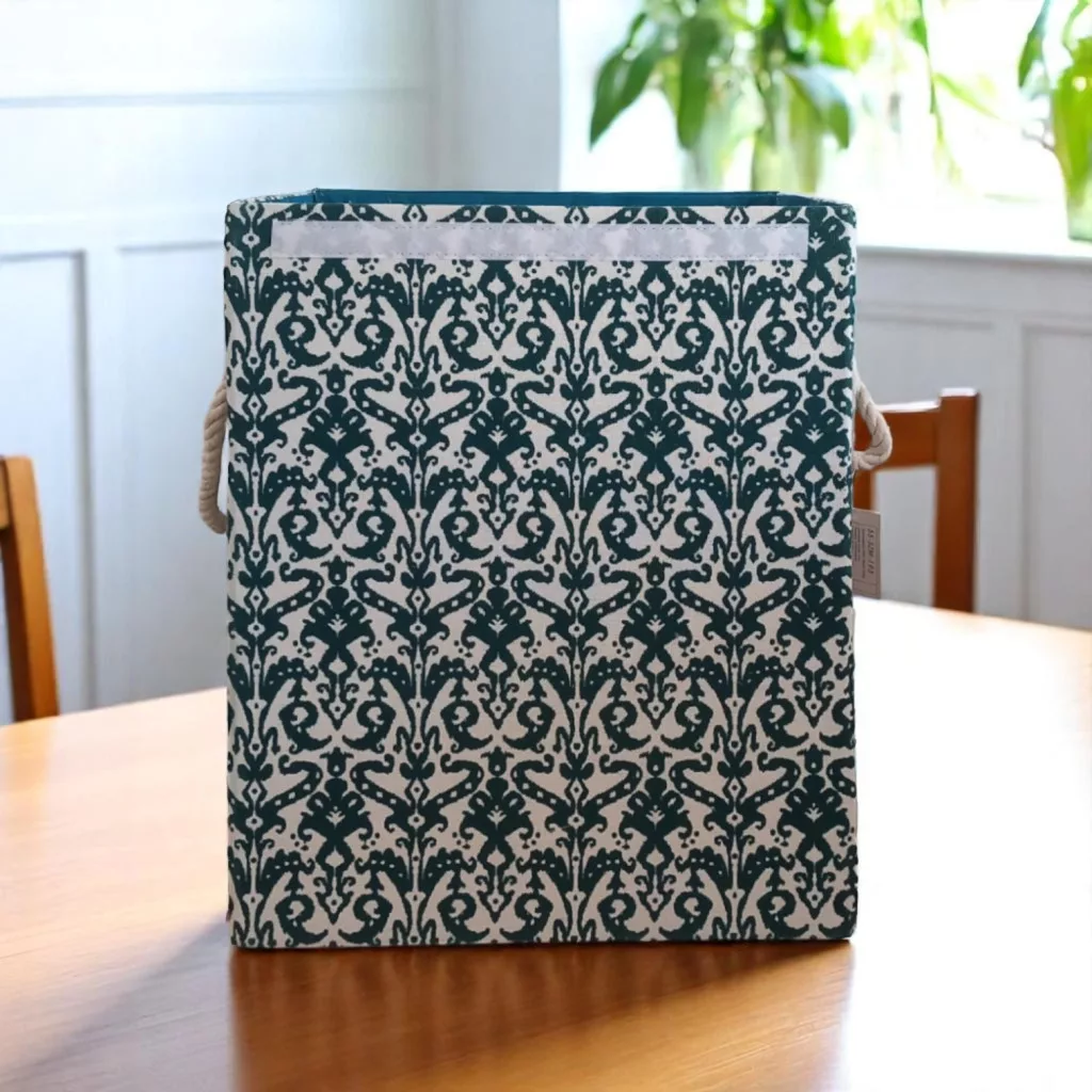 Stílusos, sötétzöld mintás összecsukható szennyestartó textilből. Kompakt mérete (40×30×50 cm) ideális kis helyiségekbe. Összecsukható kialakítása révén könnyen tárolható és szállítható, tökéletes választás utazáshoz vagy költözéshez.?