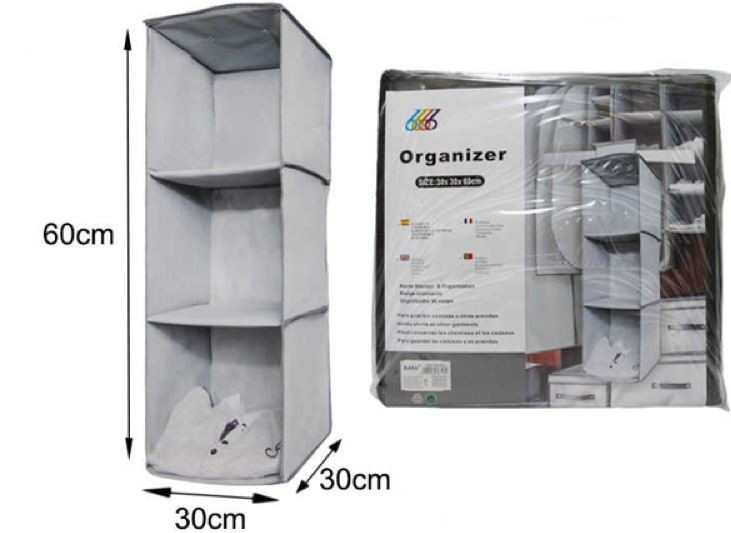 Praktikus, szekrénybe akasztható tároló 3 rekesszel. Mérete: 60x30x30 cm.