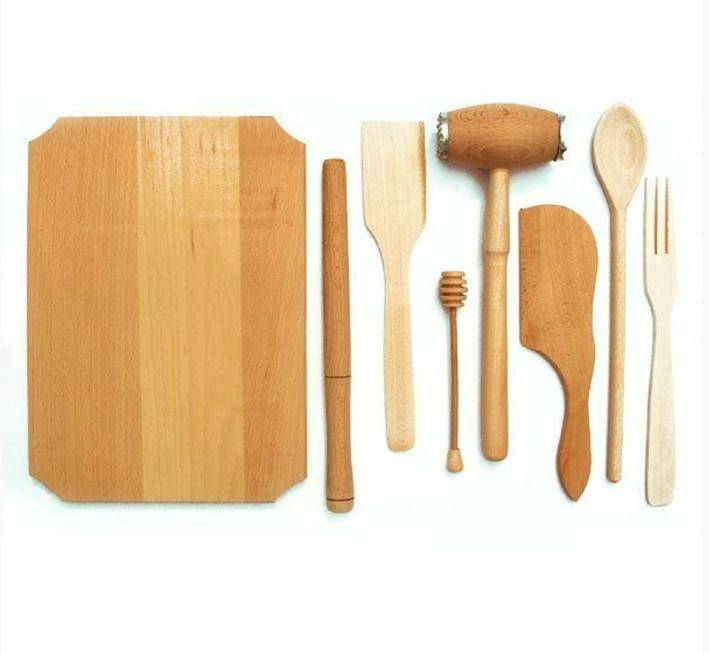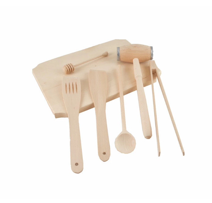 Természetes fa vágódeszka és 7 részes konyhai szett, ami a klopfolástól a tálalásig minden konyhai feladatban megbízható társad lesz. Tisztítása egyszerű – semleges folyékony mosószerrel mosd el, ne áztasd –, így hosszú ideig megőrzi szépségét és minőségét a mindennapi használat során. Tartalma: vágódeszka, klopfoló, kés, villa, mézcsurgató, fakanál, spatula, törő-verő. Mértete: vágódeszka: 25x25x1,5cm; klopfoló: teljes hossz 32 cm, nyél 26cm, fej 10x4cm; kés: 25-7 cm; villa:30x3 cm; mézcsurgató: 18 cm; fakanál: 35 cm; spatula: 30x5,5 cm; törő-verő: 32x2 cm