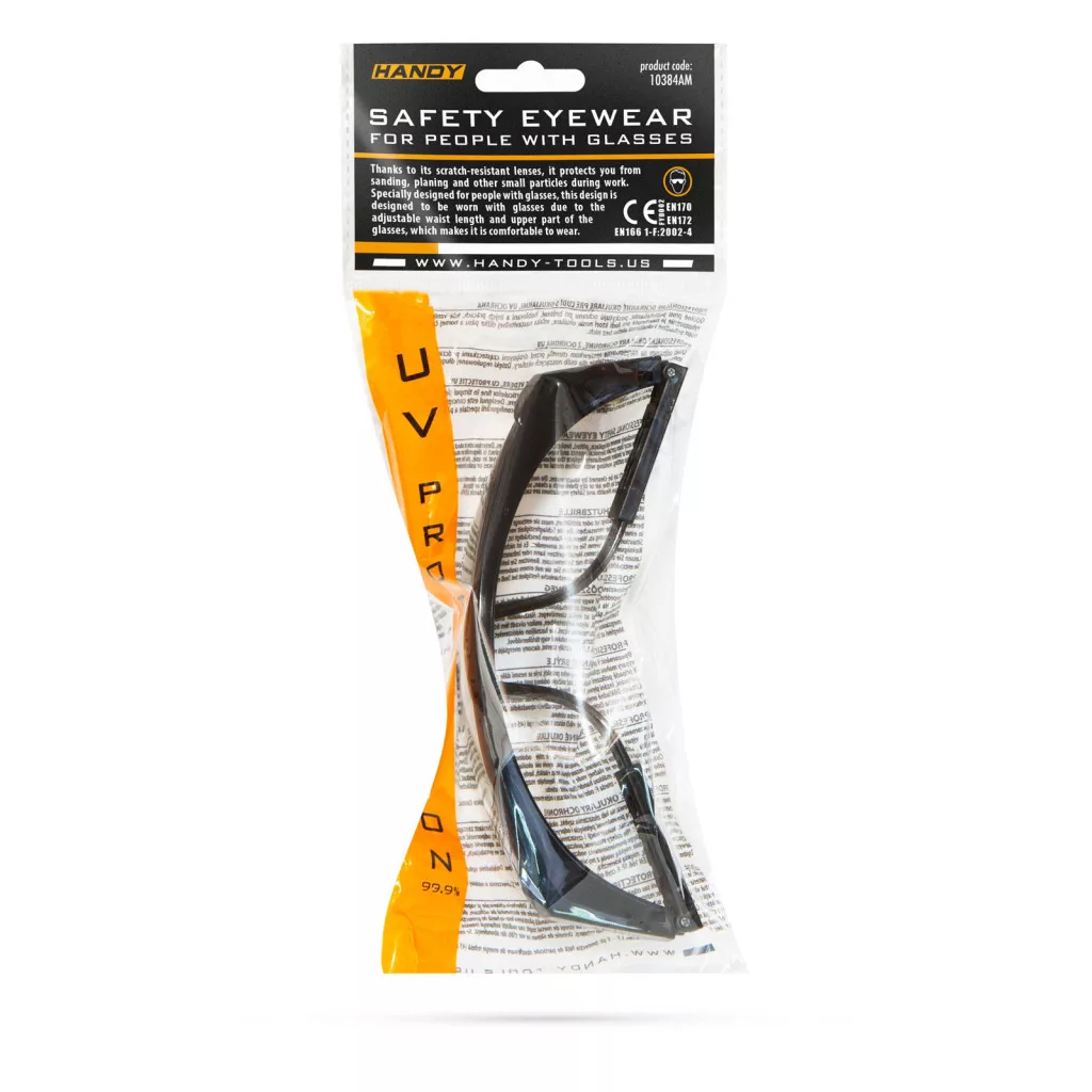 A karcolódásmentes lencséknek köszönhetően munkavégzés közben védelmet nyújt csiszolás, gyalulás és egyéb munkák során keletkező apró szemcsék ellen. Ez a kivitel kifejezetten szemüveges emberek részére készült, az állítható szárhossznak és a szemüveg felső részének kiképzése miatt, kényelmesen hordható látást segítő szemüveggel együtt, de akár anélkül is használható.