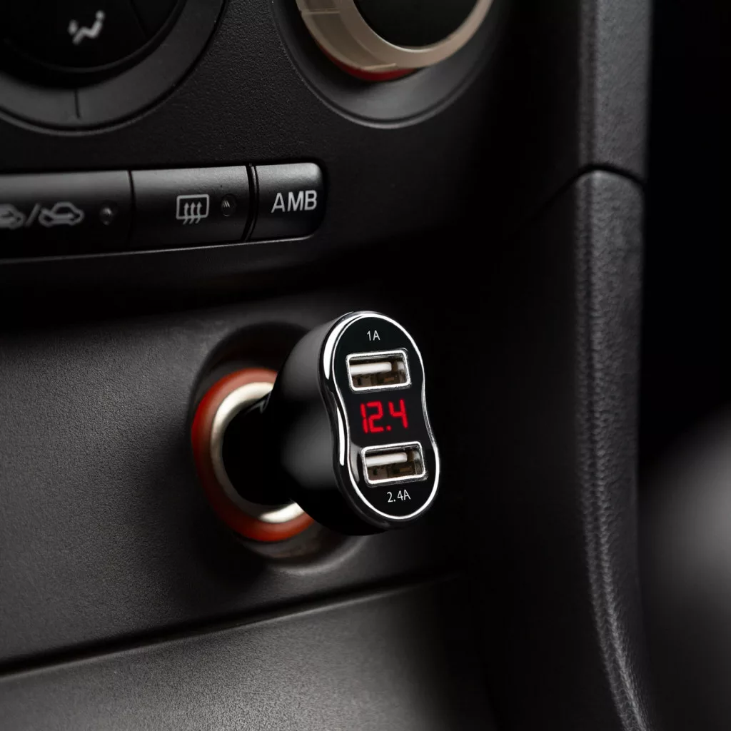 Autós szivargyújtóba dugható USB aljzat és feszültségmérő. A rejtett, két USB port között lévő, LED kijelző piros színnel mutatja a pillanatnyi feszültséget és áramerősséget. A krómozott perem elegáns megjelenést kölcsönöz, így bármely autó belterében jól mutat. A dupla USB port lehetővé teszi két eszköz egyidejű töltését.