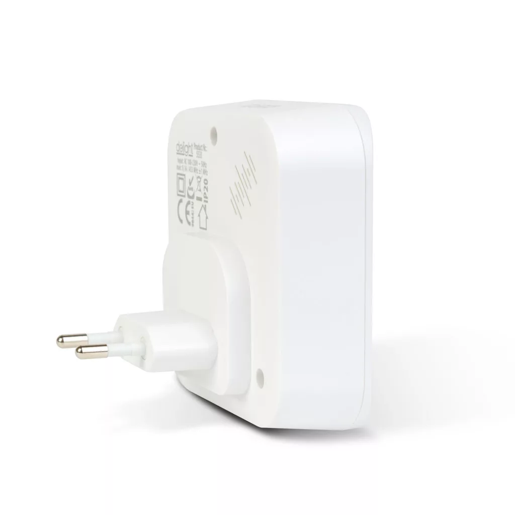A beltéri egység konnektorba csatlakoztatható, és diszkrét kék LED-fényjelzéssel is tájékoztatja a bent lévőket, hogy valaki megnyomta a csengőt. Letisztult, fehér színű kialakítása illeszkedik bármely lakókörnyezethez.